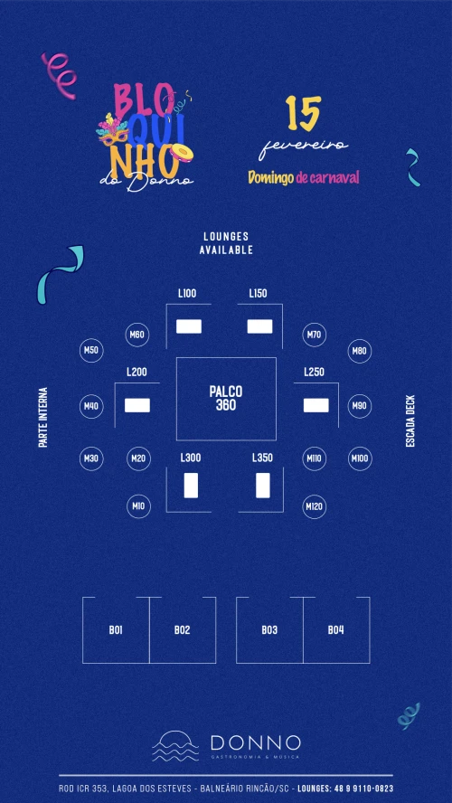 Reservas de Lounges: (48) 9 9110-0823.