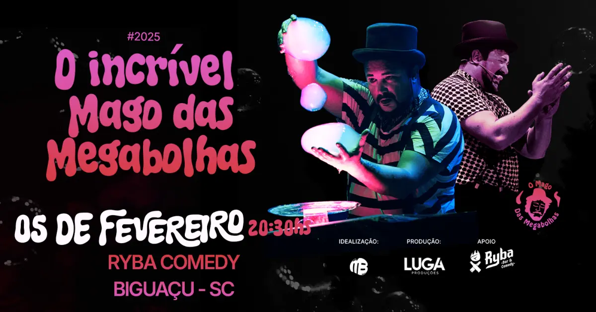 É com imenso prazer que o Ryba bar Comedy vem aqui para convidar vocês para o show Maravilhoso que irá te envolver do início ao fim com o INCRÍVEL MAGO DAS MEGABOLHAS em BIGUAÇU, no dia 05/02 às 20:30h