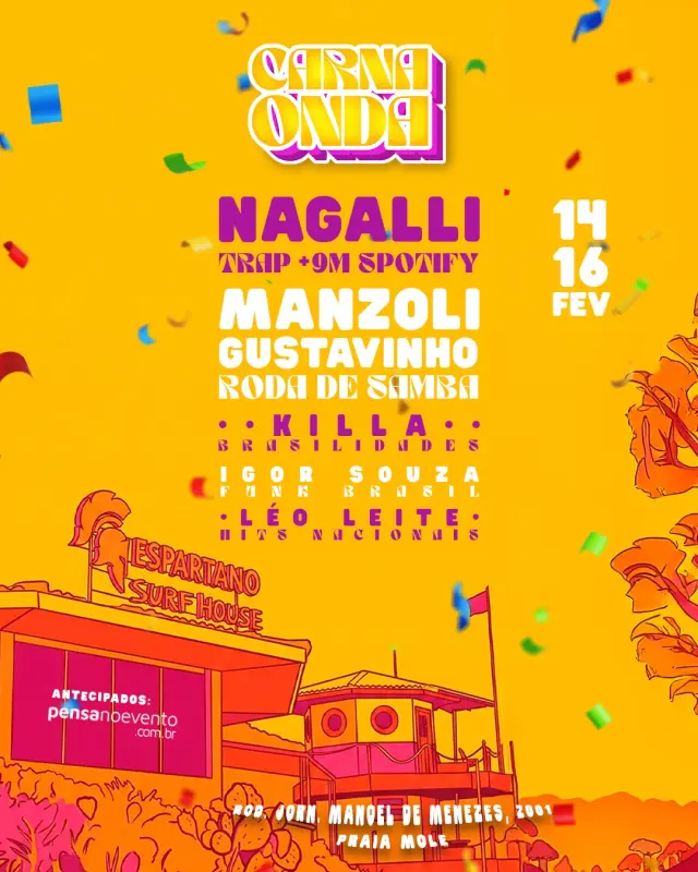 O CARNAONDA chega com dois dias de sunset na beira da Praia Mole, das 14h às 22h, com o pé na areia, o corpo em movimento e a cabeça longe de qualquer regra.