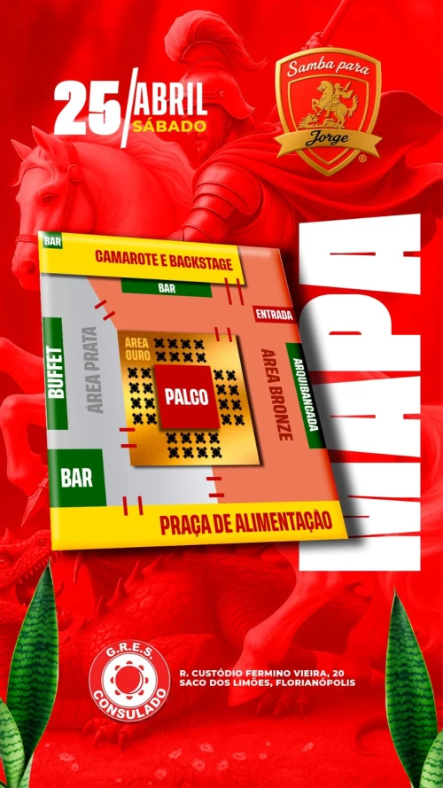 Uma experiência completa, com vários setores à sua escolha, estrutura para receber todos em um dia de muito samba, gastronomia, celebração e devoção ao Santo Guerreiro.